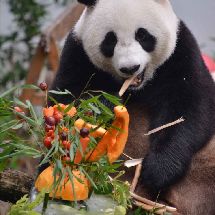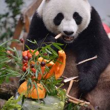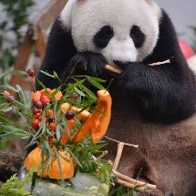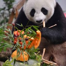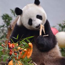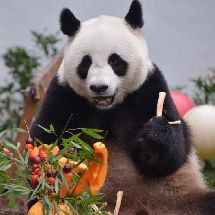 20190811,大熊猫和和九九生日会, 红红绿绿的蛋糕给和漂亮当拍照道具还挺漂亮的[哈哈][哈哈] [/cp]
