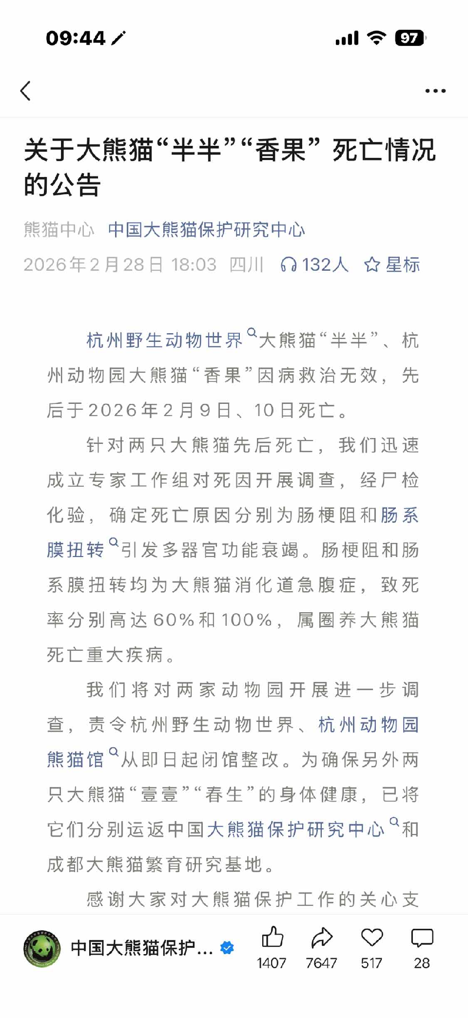 杭州野生动物世界大熊猫“半半”、杭州动物园大熊猫“香果”因病救治无效,先后于2026年2月9日、10日死亡。